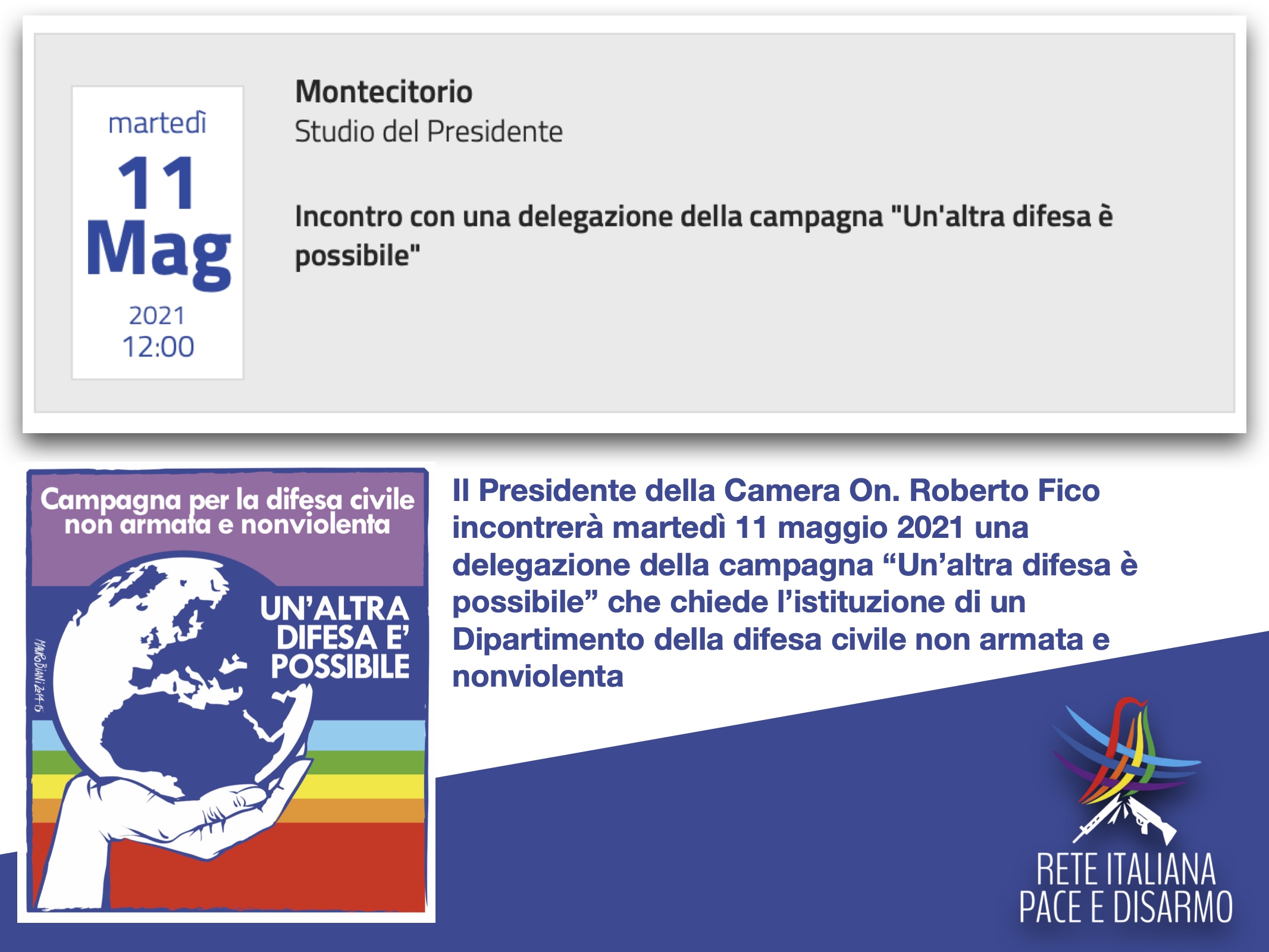 Il Presidente della Camera On. Roberto Fico incontrerà martedì 11 maggio 2021 una delegazione della campagna “Un’altra difesa è possibile” che chiede l’istituzione di un Dipartimento della difesa civile non armata e nonviolenta.